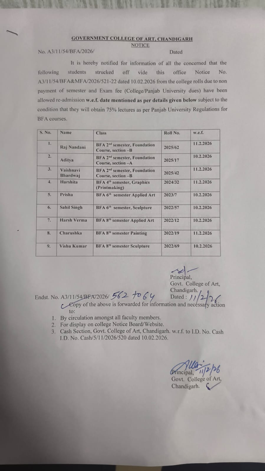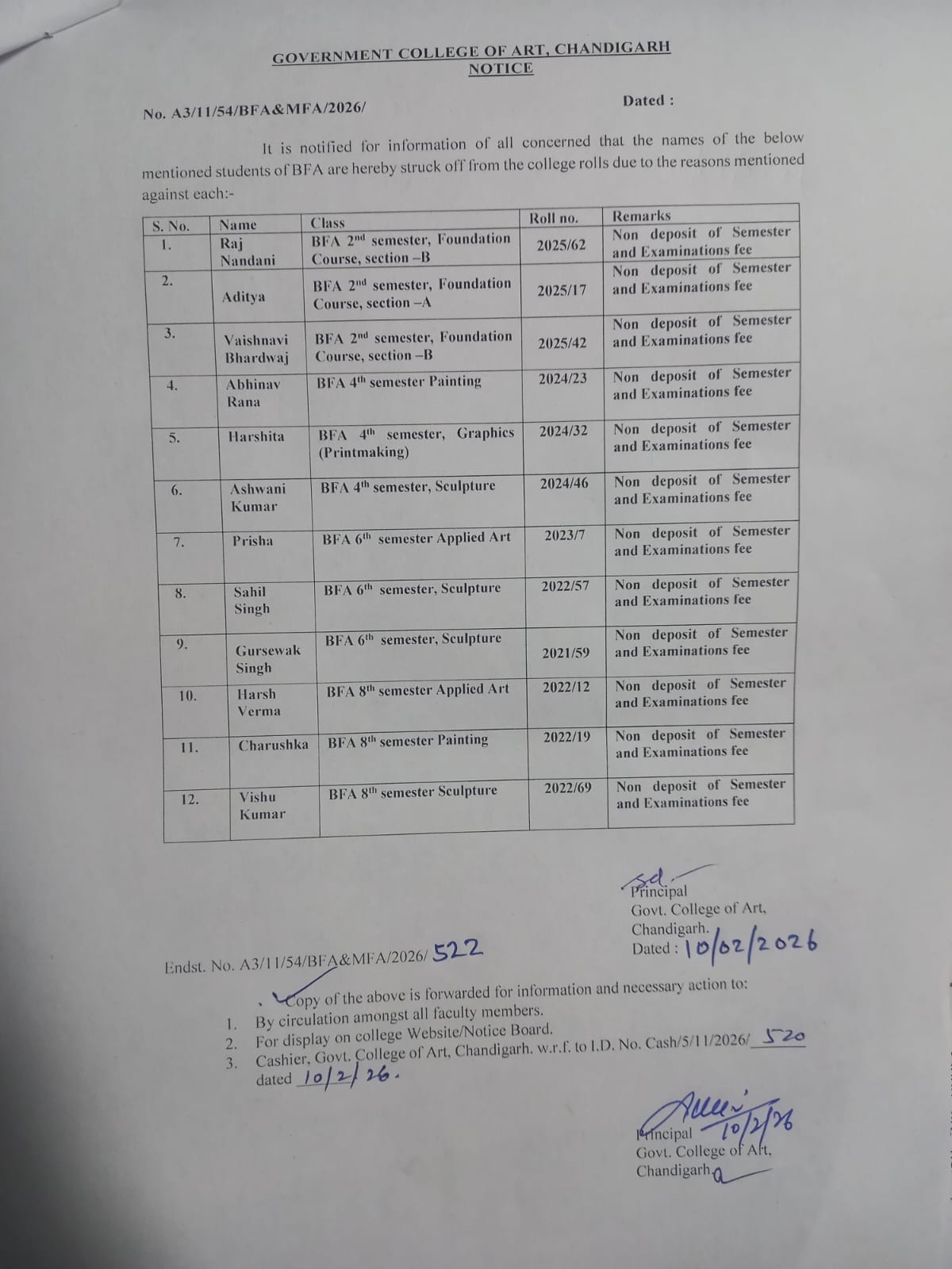 Re-admission Notice. Notice regarding name struck off from the college roll. Revised Sem & Exam Fee notice Jan-Jun 2026 Urgent order regarding semester fees, exam fees and examination form, all classes. Sem & Exam Fee notice Jan-Jun 2026 Regarding Internal Complaint Committee. Books Purchase Notice Examination forms, Semester and exam fees orders DFASA 1, 3, 5 7 Examination forms, Semester and exam fees orders MFA ADFASA 1, 3 Semester and exam fees order of BFA 1, 3, 5 7 Sem & Exam Fee notice Jul-Dec 2025 Vacant seats in All India pool (BFA -2025) Regarding Vacant seat in UT Pool (EWS Gen) BFA-2025 Vacant Seat in UT Pool (BFA~2025) MFA Sculpture Merit List Merit List of ADFASA Applied Art Merit List of MFA Applied Art Merit List Graphics (Rank) Merit List Graphics ADFASA (RANK Merit List of Painting 2025 Merit list of All india pool SCHEDULE OF INTERVIEW FOR MFA/ADFASA-2025 BFA Admission Counselling Notice 2025 Discrepancy list 2025-26 MFA/ADFASA Merit list 2025-26 BFA/DFASA Application form for Registration of MFA/ADFASA 2025-26 Download MFA/ADFASA Prospectus Online 2025-26 Download BFA/DFAD (DFASA) Prospectus Online 2025-26 Notice Environment Road Safety Education and Violence Against Women and Children Drug Abuse" paper will be conducting by online on 13th June, 2025 Notice Regarding No Dues Certificate Practical Date Sheet of BFA/ DFAD and MFA/ADFAD- even semester examinations (all courses) , May 2025 Sem & Exam fee notice 2025 with fine for students who have not paid their fee Notice-1 06 feb 2025 Notice-2 06 feb 2025 Notice-3 06 feb 2025 Sem & Exam fee notice 2025